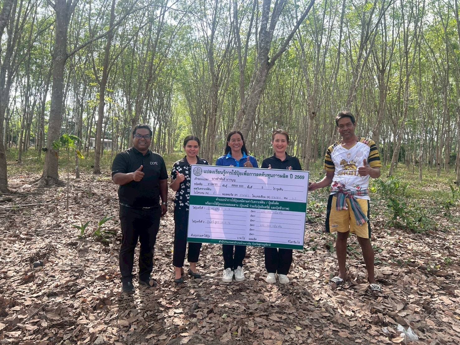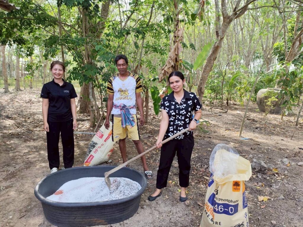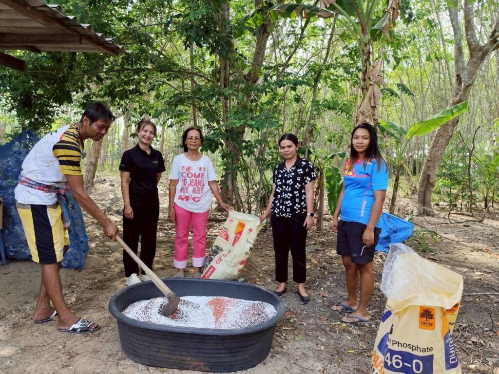 วันที่ 31 มีนาคม 2569 นางสาวนันทวัน วัฒนา เกษตรอำเภอบ้านนาเดิม มอบหมายให้ นางมิ่งมนัส สุภากร นายชัยวัฒน์ บุญพัฒน์ และนางสาวรุ้งนภา กัลพฤกษ์ นักวิชาการส่งเสริมการเกษตรชำนาญการ เยี่ยมเยียนเกษตรกรต้นแบบยางพารา แนะนำใส่ปุ๋ยหมักหรือปุ๋ยอินทรีย์ใส่ต้นยางพาราเพื่อปรับสภาพดิน และแนะนำการผสมปุ๋ยเคมีตามค่าวิเคราะห์ดิน เพื่อลดต้นทุนการผลิต ผสมปุ๋ยสูตร 15-7-18 และ ปุ๋ยสูตร 20-7-16 เพื่อใช้ในสวนยางพาราเปิดกรีด ช่วยเพิ่มประสิทธิภาพการผลิตยางพารา และช่วยลดต้นทุนการผลิตยางพารา ณ หมู่ที่ 2 ตำบลนาใต้ อำเภอบ้านนาเดิม จังหวัดสุราษฎร์ธานี