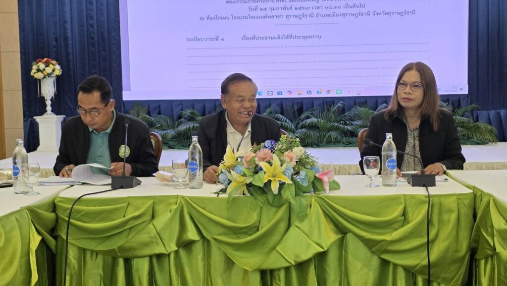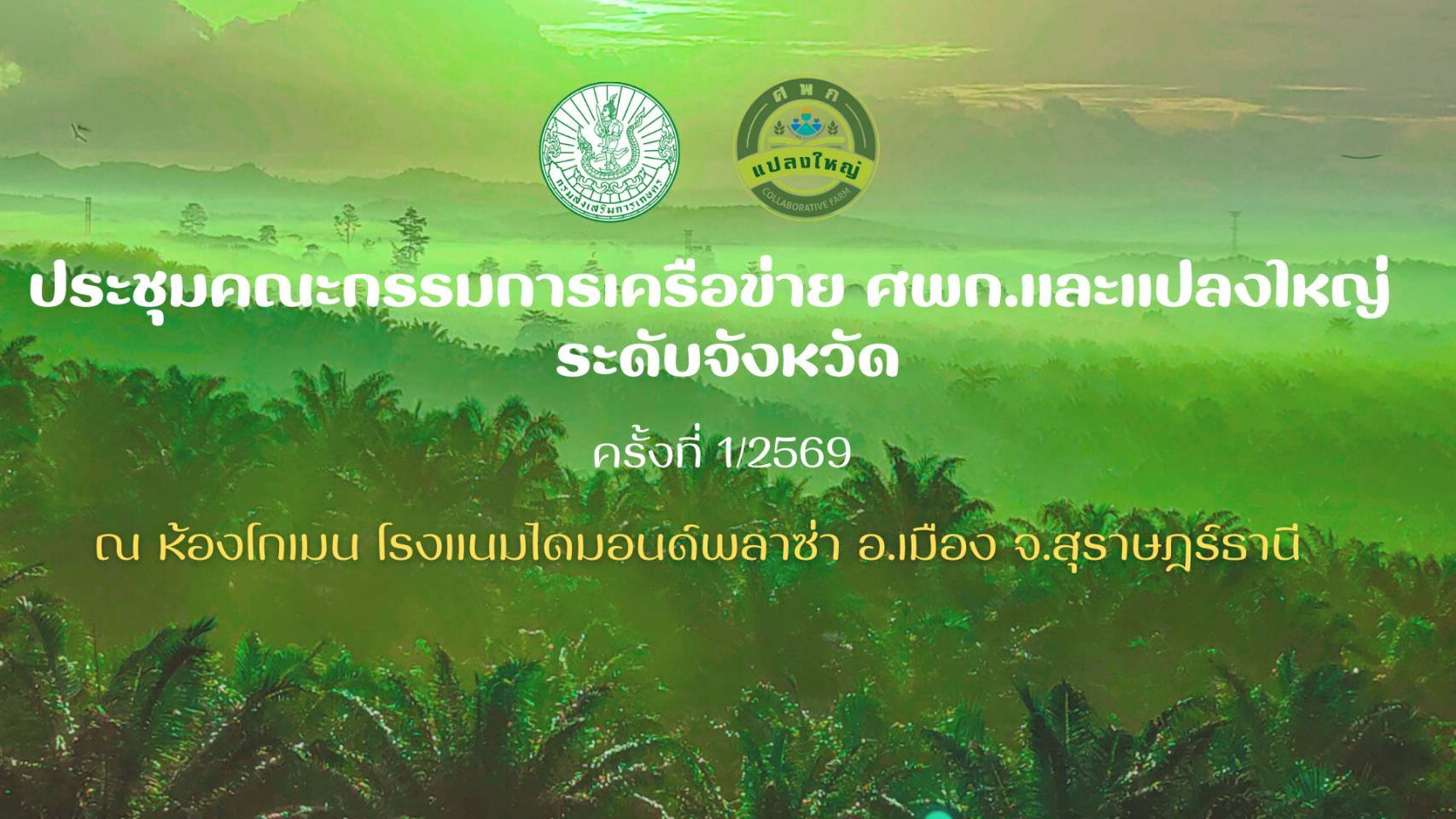 วันที่ 25 กุมภาพันธ์ 2569 นายสำราญ ครรชิต ประธานคณะกรรมการเครือข่ายแปลงใหญ่ ระดับจังหวัด และนายสุมาตร อินทรมณี ประธานคณะกรรมการเครือข่ายศพก. ระดับจังหวัด ประธานการประชุมคณะกรรมการเครือข่าย ศพก. ระดับจังหวัด ครั้งที่ 1/2569 โดยมี นางสาวกำไลทิพย์ เศรษฐ์วิชัย เกษตรจังหวัดสุราษฎร์ธานี พบปะคณะกรรมการฯ พร้อมให้แนวทางการดำเนินงาน ศพก. แปลงใหญ่ ณ ห้องโกเมน โรงเเรมไดมอนด์ อำเภอเมือง จังหวัดสุราษฎร์ธานี การประชุมขับเคลื่อนเครือข่าย ศพก.ในครั้งนี้มีวาระสำคัญที่ร่วมกันหารือในประเด็นต่างๆ ดังนี้