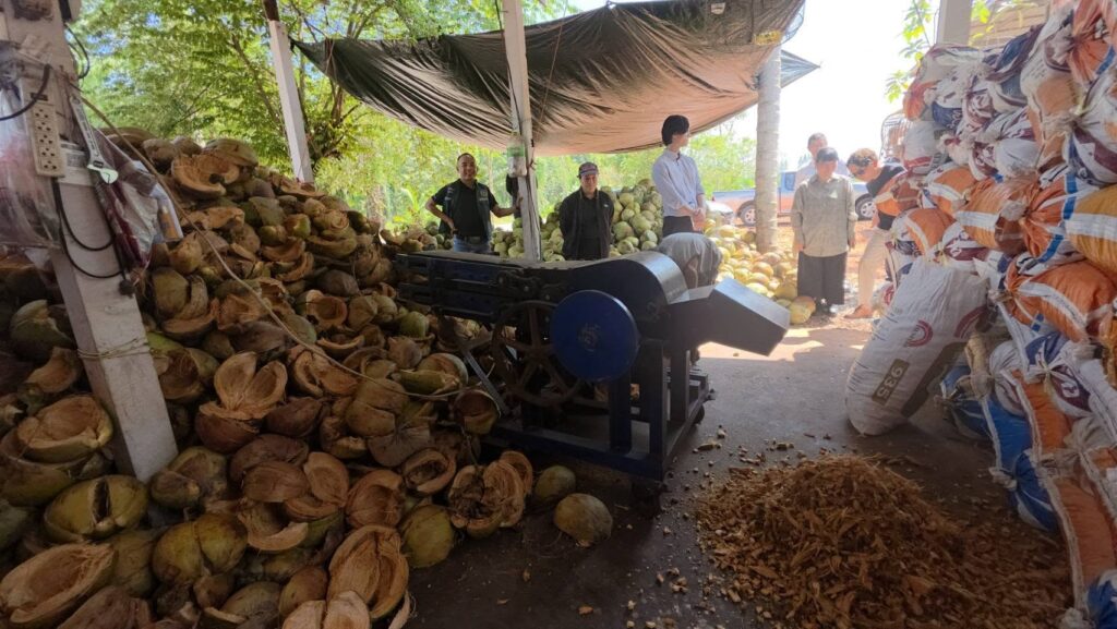สวนมะพร้าว : ลงพื้นที่เยี่ยมชมสวนมะพร้าวจำนวน 4 จุด ได้เเก่ แปลงมะพร้าว โรงสับมะพร้าว โรงปอกมะพร้าว โรงงานใยมะพร้าว เพื่อศึกษาปริมาณทางกายภาพของวัสดุเหลือใช้ เช่น กาบมะพร้าว และกะลามะพร้าว ที่สามารถนำไปเป็นเชื้อเพลิงชีวมวลได้