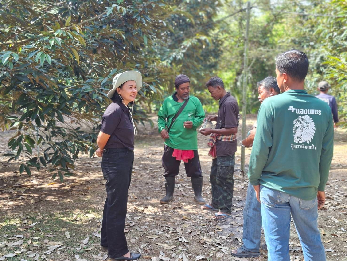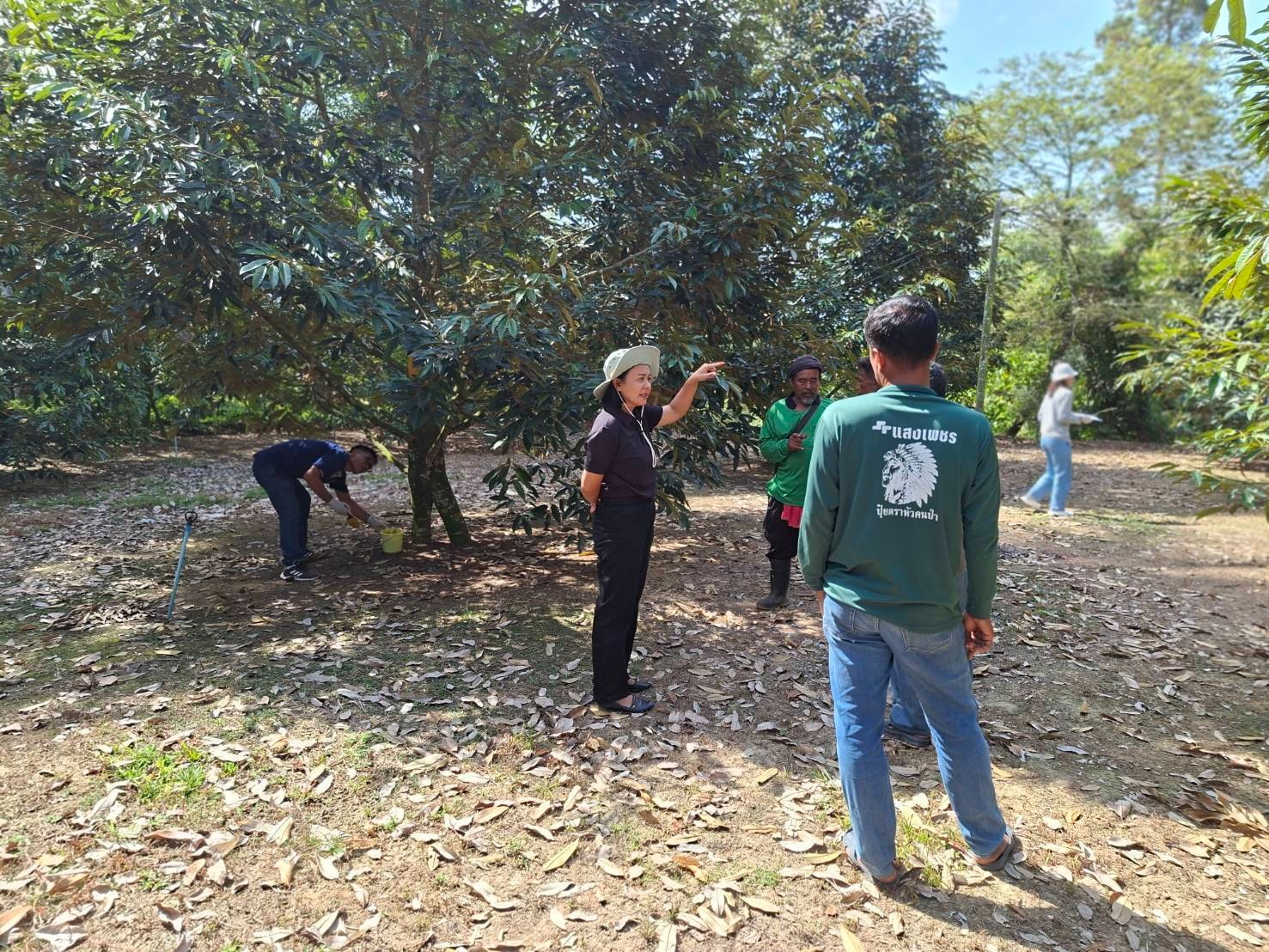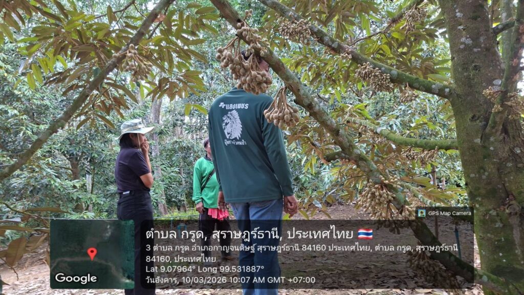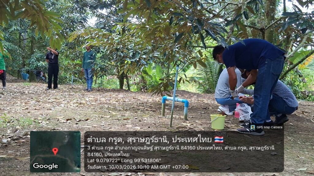 วันที่ 10 มีนาคม 2569 นางสาวสมัย สังข์ทองงาม เกษตรอำเภอกาญจนดิษฐ์ พร้อมด้วย เจ้าหน้าที่สำนักงานเกษตรอำเภอกาญจนดิษฐ์ ลงพื้นที่ หมู่ที่ 2 บ้านท่าเฟือง ตำบลกรูด เยี่ยมเยียนกลุ่มเกษตรกรแปลงใหญ่ทุเรียนตำบลกรูด ติดตามการออกดอกทุเรียนซึ่งอยู่ในระยะ มะเขือพวง ติดตามสถานการณ์การระบาดศัตรูพืชและศูนย์จัดการศัตรูพืชชุมชนตำบลกรูด ร่วมผลิตน้ำสกัดเห็ดเรืองแสงสิรินรัศมี โดยมีเจ้าหน้าที่จากสำนักวิจัยและพัฒนาการเกษตรเขตที่ 7 สุราษฎร์ธานี มาทำวิจัยการใช้น้ำสกัดเห็ดเรืองแสงสิรินรัศมีเพื่อรักษาโรครากเน่าโคนเน่าในต้นทุเรียน จากนั้นได้เยี่ยมเยียนแปลงทุเรียน นายสุภัทรพร พรหมทวด แปลงสมาชิก ศดปช.ตำบลกรูด เก็บตัวอย่างดินวิเคราะห์ เพื่อสนับสนุนปัจจัยจัดทำแปลงเรียนรู้ด้านการจัดการดินและปุ๋ยต่อไป ณ หมู่ที่ 2 ตำบลกรูด อำเภอกาญจนดิษฐ์ จังหวัดสุราษฎร์ธานี