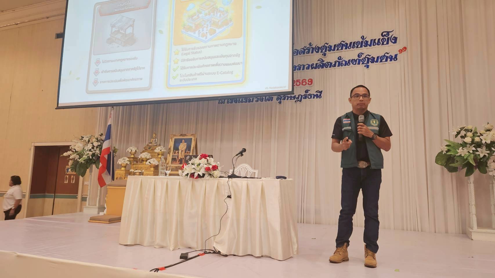 วันที่ 27 มีนาคม 2569 นายสุรเดช ทองมาก เกษตรอำเภอเมืองสุราษฎร์ธานี พร้อมด้วยนางประภาศรี เสมียนเพชร นักวิชาการส่งเสริมการเกษตรชำนาญการ เป็นวิทยากรให้ความรู้เรื่อง การจดทะเบียนวิสาหกิจชุมชน ในกิจกรรมแสดงผลิตภัณฑ์จากโครงการเงินอุดหนุนส่งเสริมอาชีพและฝึกอบรมเชิงปฏิบัติการ