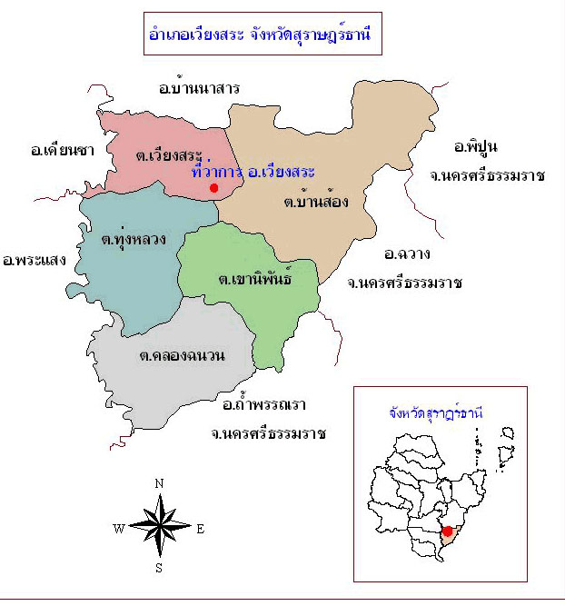 ที่ว่าการอำเภอเวียงสระ หมู่ที่ 8 ตำบลเวียงสระ อำเภอเวียงสระ จังหวัดสุราษฎร์ธานี 84190 อำเภอเวียงสระ ตั้งอยู่ทางทิศตะวันออกเฉียงใต้ของจังหวัด