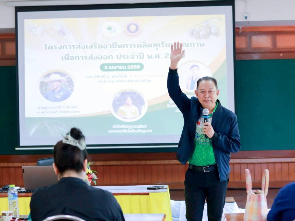 วันที่ ๓ เมษายน ๒๕๖๙ นายอาหมาด มณีหลำส๊ะ เกษตรอำเภอเวียงสระ พร้อมด้วยนางสาวสุภาพร จรา นักวิชาการส่งเสริมการเกษตรชำนาญการ ร่วมโครงการส่งเสริมอาชีพการผลิตทุเรียนคุณภาพเพื่อการส่งออก ประจำปี ๒๕๖๙ จัดโดยสำนักงานเทศบาลตำบลบ้านส้องเพื่อเกษตรกรชาวสวนทุเรียน มีนายศิริ เฮ่าสกุล นายกสมาคมชาวสวนทุเรียนภาคใต้ร่วมกิจกรรมครั้งนี้ ซึ่งมีวิทยากรที่มากประสบการณ์ อาทิเช่น ดร.วารินทร์ อินทนา ผู้เชี่ยวชาญการรักษาโรครากเน่าโคนเน่าในทุเรียนแบบเคมี-อินทรีย์ จากมหาวิทยาลัยวลัยลักษณ์ ผู้ใหญ่ดำรงศักดิ์ สินศักดิ์ เกษตรกรดีเด่นจังหวัดชุมพร ผู้มีประสบการณ์การผลิตทุเรียนในสภาพอากาศแปรปรวนและการคัดเกรดทุเรียน กำนันพิเชฎฐ เทศรัตน์ เกษตรกรดีเด่นจังหวัดชุมพร ณ ห้องประชุม ชั้น ๓ สำนักงานเทศบาลตำบลบ้านส้อง อำเภอเวียงสระ จังหวัดสุราษฎร์ธานี